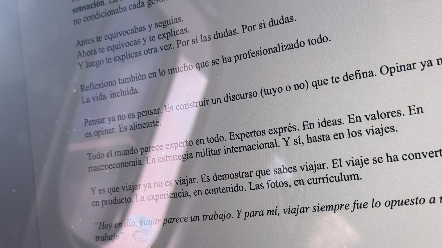 Y es que viajar ya no es viajar. Es demostrar que sabes viajar. El viaje se ha convertido en producto. La experiencia, en contenido. Las fotos, en currículum.