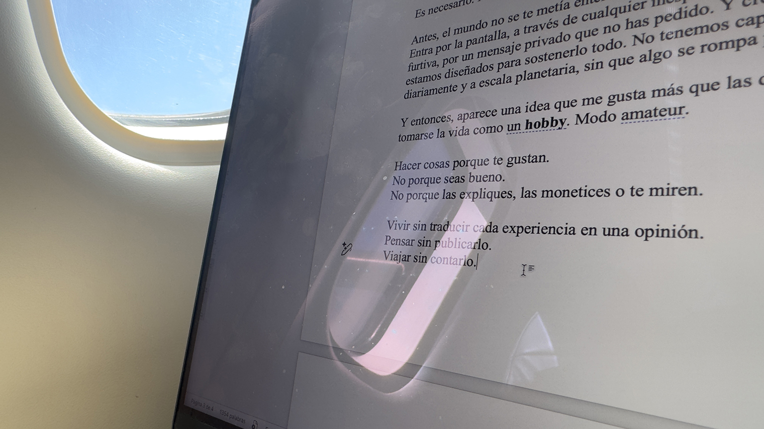 Hacer cosas porque te gustan. No porque seas bueno. No porque las expliques, las monetices o te miren. Vivir sin traducir cada experiencia en una opinión. Pensar sin publicarlo. Viajar sin contarlo.